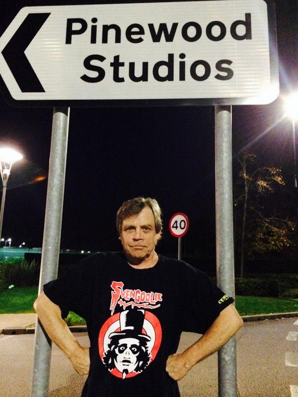 Ironically…around the time the above picture was taken, the REAL Luke Skywalker, Mark Hamill, Tweeted Svengoolie & I (I’m still in shock over being included in that Tweet) a photo of him wearing his Svengoolie shirt outside of Pinewood Studios in England…a.k.a. the set of STAR WARS Episode VII! My youth was defined by both Svengoolie and STAR WARS so it’s incredibly surreal to see those worlds come together of late. Needless to say, aside from having to take my poor kids Trick-or-Treating in the middle of a sleet-storm, the State having officially made this Svengoolie Day, coupled with the Mark Hamill Tweet, makes this the best Halloween ever! Hamill looked amazing and when he later asked me if I’d received the photo I told him he looked like he just stepped off the set of Return of the Jedi.