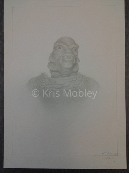While working on the Creature drawing, it occurred to me that individual portraits of all the REMCO monsters would make an intriguing series. Besides that, I’ve always loved the sci-fi, fantasy, and comic book portfolios that were kind of a trend in the late 1970s through the 1980s. As I work slowly anyway, these thoughts had plenty of time to congeal into the single idea of a fine art portfolio series that would allow me to work in a fine arts style while indulging in subjects and a marketing approach that I loved. The idea to release the prints individually—each of them signed and numbered, sold in an illustrated envelope with a unique cover letter introducing each figure/portrait—came partly of necessity (allowing me the time to work at my necessary slow pace) and partly from the example of John James Audubon, who sold his ongoing The Birds of America in England via a subscription method that both delivered artwork while funding further drawings. Though the Creature is one of the later and rarer REMCO 9 inch monsters, he makes a great starting character. I plan to produce only 100 Creature prints, and how these sell will help me to determine where to limit editions of the monsters which follow—Dracula, Frankenstein, Wolf Man, and the Mummy (though the order is still undecided). I hope there will be enough interest to warrant a print run of 200 each. In that event, just as with the toys, the Creature will prove one of the rarer items—a fun parallel. Further keeping with that, I would in some way like to make the Phantom, at the end of the series, a special premium and thank-you to those who supported the project from the beginning, perhaps limiting the run to a mailing list of faithful subscribers or giving them exclusive first dibs and (if I can afford it) a rebate.