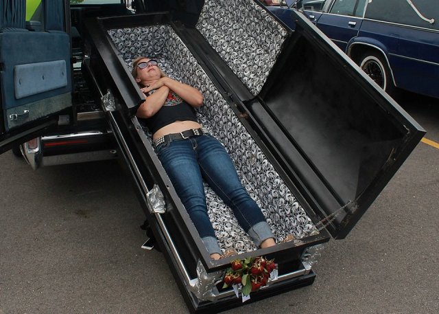 After Susan arrived we checked out the hearses and one of the first ones featured an open casket hanging outside of it. I jokingly asked Susan if she wouldn’t mind posing in it for a picture and, without skipping a beat, she jumped right in. This is definitely the kind of person you want to take to horror events…someone who doesn’t mind hamming it up and having a good time!