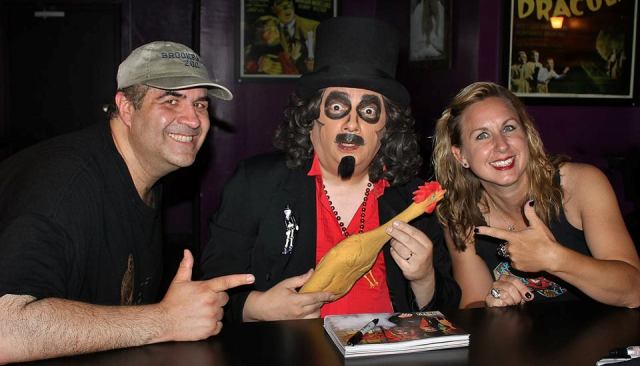 When we finally made it into the building where Svengoolie was signing autographs, we discovered it was a game room with billiard tables and KISS and Elvira pinball machines. “Oh we gotta get a picture of Svengoolie in front of that!” I said, pointing to the one featuring the Mistress of the Dark. Later Sven would get a shot in front of it, courtesy of Jim Roche (and seen below)!
