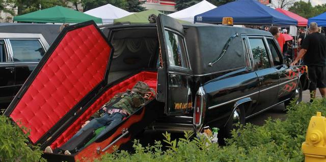 I arrived at 5pm and the festivities were already well underway. I parked my car; a red Toyota RAV-4 which, in contrast with today’s featured vehicles, may as well have been the Partridge Family Bus. Before reaching the bulk of the hearses, I encountered a collection of vendors selling some pretty neat hand-crafted items. I was especially pleased to see one of my favorites, Blood Brood FX.