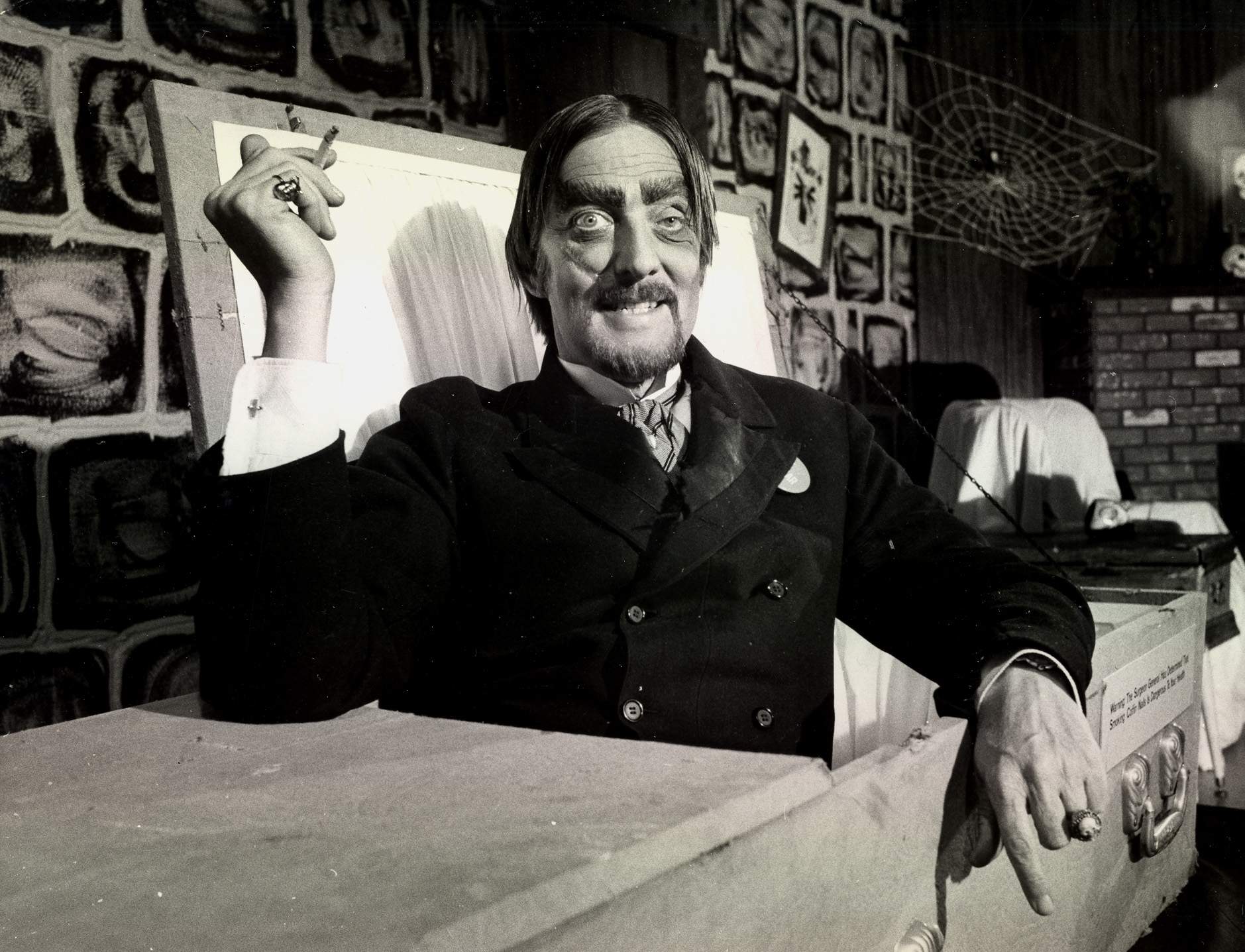 Bennick grew a goatee after a Vincent Price role, parted his hair down the middle as a nod to the horror host Zacherley, and added a facial scar. Further adding to his character’s appearance was an authentic glass eye after losing his left one in a car accident. Thus Dr. Paul Bearer, the gravely voiced undertaker who spewed puns while introducing his captivated viewers to their favorite scary movies, was born!