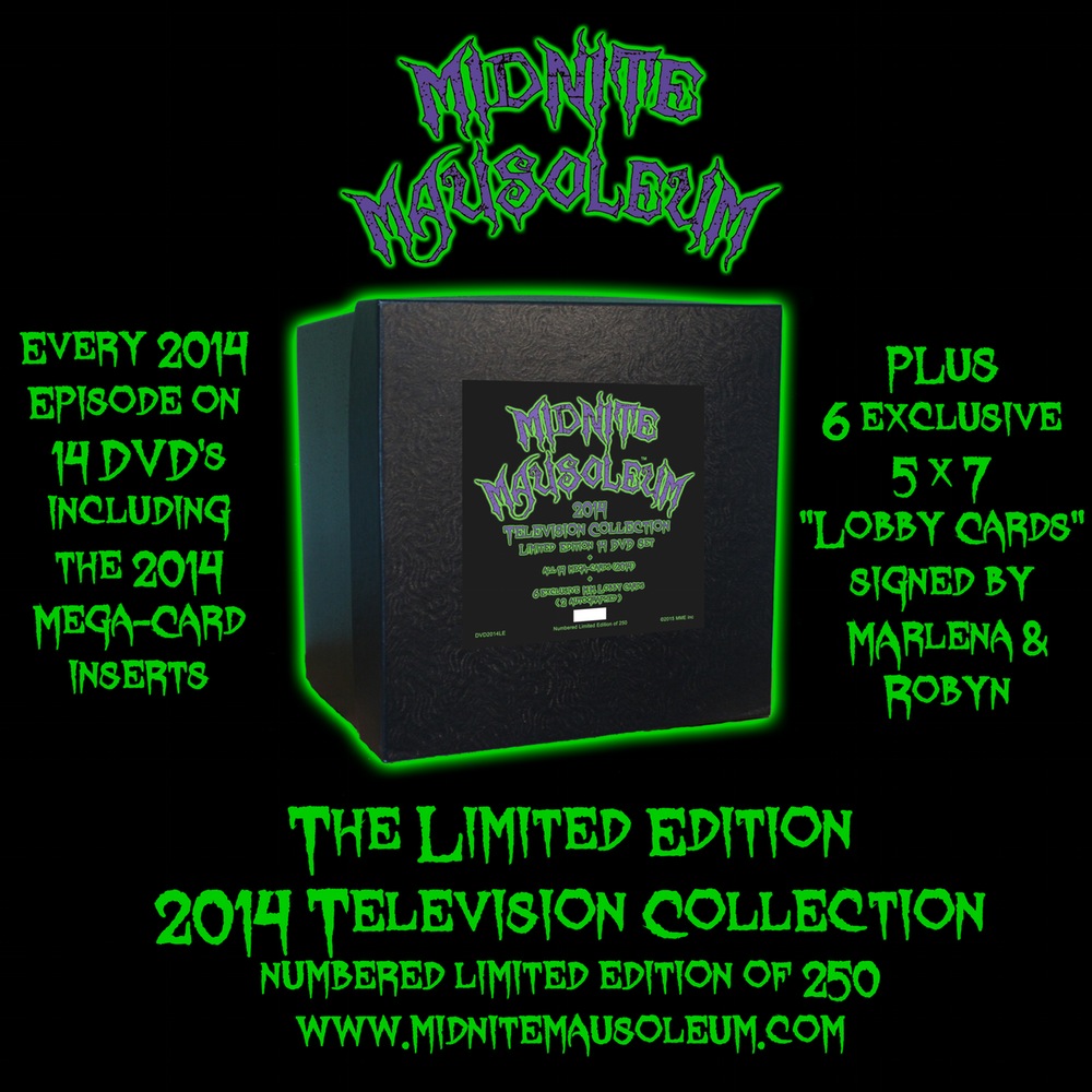 Also available for pre-order and shipping on October 26th is this limited edition of 250 DVD box set containing every 2014 television episode of MIDNITE MAUSOLEUM! Join Marlena Midnite and her friends Robyn, Wolfred, Franklin, Bones and Creepy Charlie as they re-launch Midnite Mausoleum via Broadcast Television!