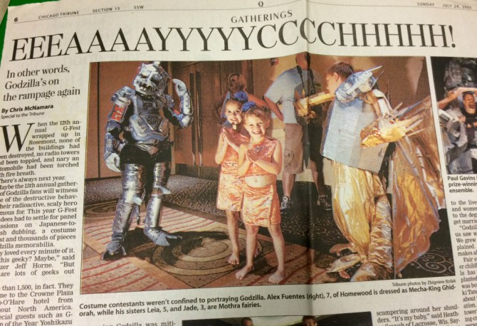 Not long ago, this section of G-FEST was headed by Frank Parr who used to run Artist Alley. Parr is the founder and lead illustrator of Dragonfyre Studios and, around the time it began, I’d photographed the Crowne Plaza for him to use as reference material for his comics. In exchange, he made me some artwork of my kids in the costumes they wore at G-FEST that year (2005). Although my costuming skills were pretty horrendous, I’m proud to say the kids made it into the Chicago Tribune that year.