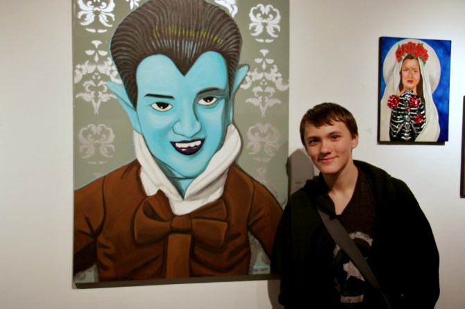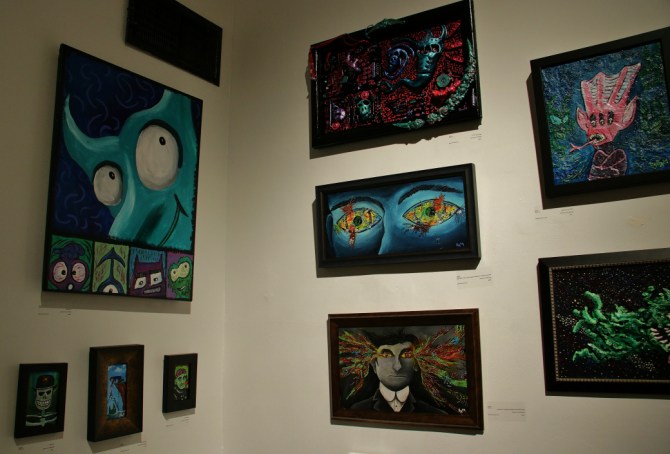 I assumed the main gallery was the bulk of the event until John called our attention to a set of stairs outside the building and leading to a second floor. “There’s a lot more stuff up there,” he advised. Just before ascending, we were welcomed by the sight of a plastic jack o’lantern. Now in October these things are a dime a dozen but in May? Well let’s just say it was like seeing a sparkling oasis after spending a long day in the desert.