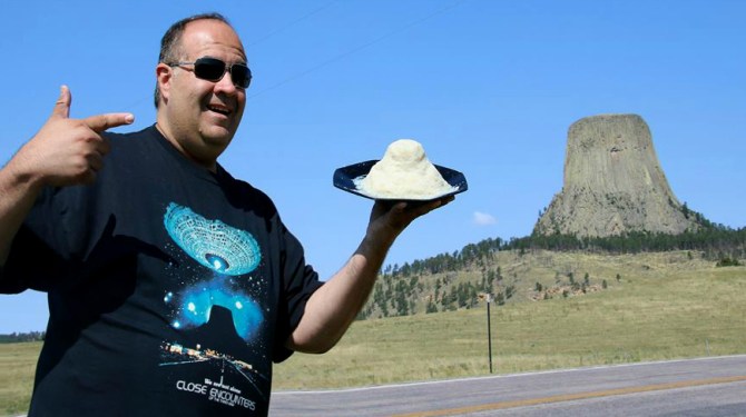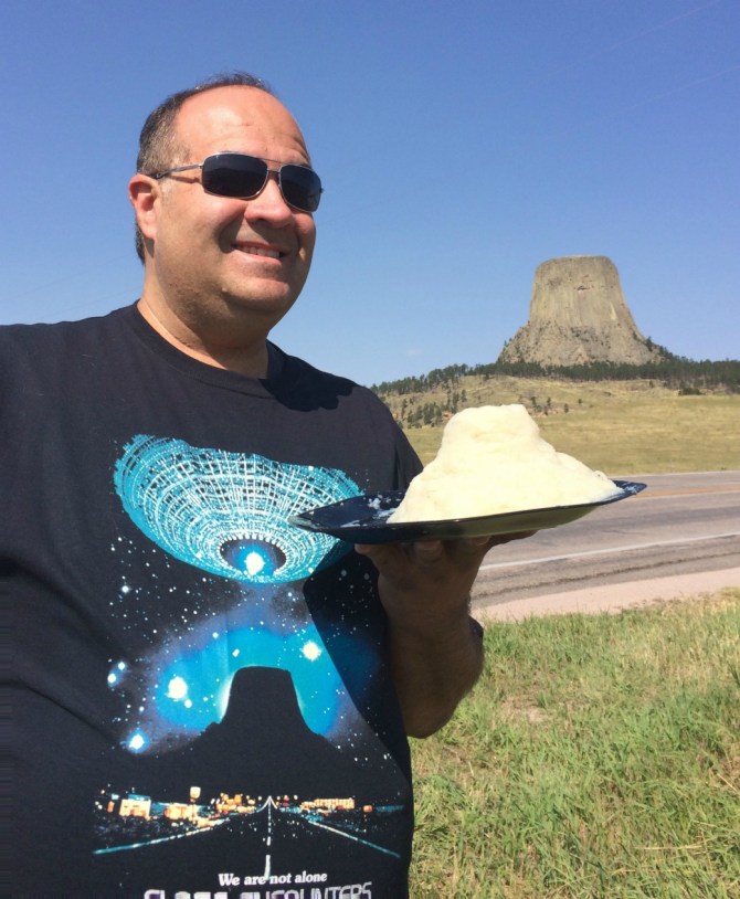 In the film, Roy is compelled to visit the Devil’s Tower and works out his visions via sculpting; most notably with his mashed potatoes. I had it in my head that I was going to take a photo in front of the Devil’s Tower holding my own spuds replica of Roy’s. The hard part was keeping them fresh for the three days it took me to get there.