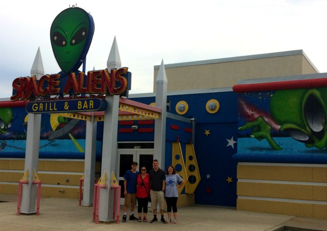 If you’re in North Dakota and looking for something fun to do (and chances are if you’re in North Dakota, you DEFINITELY will be), then make sure to stop by the Space Alien Grill and Bar! It was the tail end of our family road trip and we were joined by my eldest son, Alex, who is stationed in Minot. He’d spend the last two nights of our vacation with us in Bismarck as I planned that Saturday; our only full day together. North Dakota is the least visited state in the US and, since it’s 90% farmland, I can understand why. Another interesting tidbit – if North Dakota ever seceded from the United States, it would be the country with the third most nuclear weapons. Amid all the nukes and cows lies Bismarck, an oasis of sorts with a small zoo, museum, and all the usual stores and chains (including my favorite coffee place, Caribou, which is now extinct from the Midwest) most of us take for granted. Imagine my happiness when I not only discovered this novelty restaurant but that it was right down the street from our hotel!