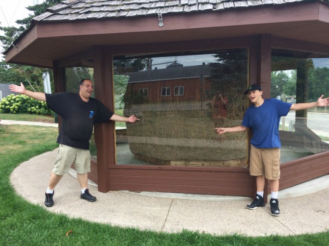 As we neared our quarry, I started playing the Weird Al song on my Mp3 player, timed to end just as our GPS had us arriving. It was easy to find and we pulled into a parking area across the street. Just like the song, the Twine Ball was indeed “under a makeshift pagoda” and where we could see it from our car. Unlike the song, however, this dad did not fall to knees and cry and cry but laughed his ass off instead. In fact, my eldest daughter, Leia, and I laughed so hard we could barely get out of the car. I guess seeing it brought home the sheer ridiculousness of it all and I held my sides and chuckled all the way across the street.