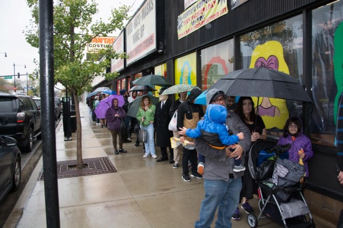 For lack of a better word, visibility sucked but finding the place was a breeze thanks to my WAZE app. If you use an iPhone, I highly recommend it over Google Maps and, no, I’m not getting paid to say this. By the time I arrived they were already 45 minutes into the appearance and a line stretched across the front of the store (which, as Donald Trump would say, was “Yuge!”). Of course I’ve seen Svengoolie draw long lines before but was particularly impressed with this one considering it was outside in a downpour and with no awnings offering protection. I, myself, debated whether or not I should high tail it home and skip this appearance altogether but instead tucked my SLR camera under my sweatshirt and headed over.