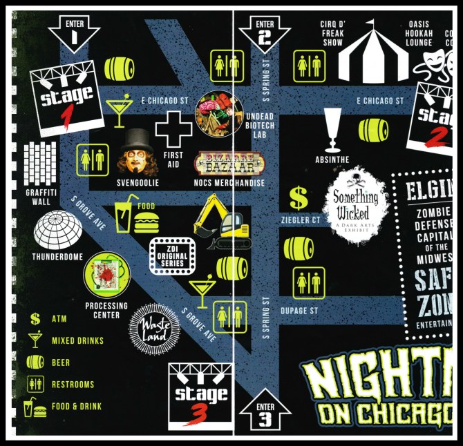 I arrived at Elgin’s Nightmare on Chicago Street early this year. It seemed a wise choice in lieu of their having pre-sold over 8,000 tickets and my desire to find a decent parking spot. With the weather clear and in the ‘70s that day, it was no surprise that they’d end up bringing an additional 10,000 and technically “sell out” (though I don’t believe anyone was turned away). My first stop was Svengoolie Headquarters where Elizabeth Haney and Alice Moring had my passes. The local-turned-national horror host has been a staple of this event since the very beginning and this year his HQ was right across from Elgin’s Martini Room. It offered a back room where I could store my Sven shirt in anticipation of his appearance at 8pm. Alice and Elizabeth would end up surprising me with one of their own shirts which really made me happy since I loved this year’s design. I think it’s because it reminded me of the cover of an ‘80s comic book and I was BIG comic nerd back in the day.
