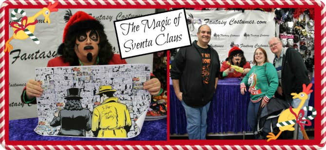 Flying in with his red-nosed, rubber chicken, Sventa Claus dropped in on Fantasy Costumes last weekend to greet fans. I’d seen him there last October in his less festive, Svengoolie, persona and it was notable for attracting a large turnout despite inclement weather. In contrast, this December day was sunny and in the 60’s proving once again that, so far as the weather goes, Chicago’s always riding the Bi-Polar Express. This would mark the horror host’s final 2017 appearance and third as Sventa. Unable to attend the previous two, I made it a point to rearrange my schedule for this one. And so, with a camera strap around my neck and a poster tube under each arm, I made my way to Fantasy Costumes a.k.a. my 82nd Svengoolie appearance!