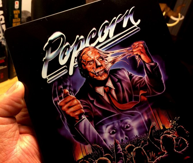 Having graduated Class of ’89, the early ‘90s heralded my transition into adulthood. Although I had a job and was attending community college, those hedonistic days were also spent partying and having drunken horror movie marathons with friends. Although we may not have had any trouble staying dry, the same couldn’t be said for our entertainment. The golden age of slashers seemed to disappear as fast as our teens with trips to the video store yielding fewer and fewer results. Needless to say, any ‘80s-style horror stragglers were a welcome sight and today’s SteelBook Spotlight is a prime example. Whether the film’s charismatic masked killer or its “movie within a movie” homage to ‘50s sci-fi films, Popcorn made for an unexpectedly fun night back in 1991. And now, nearly three decades later, it’s been given an upgrade.