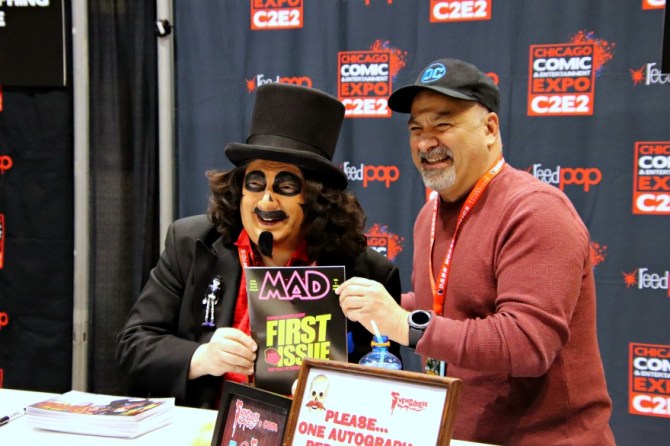 During the signing, Sven was interrupted by Dan Didio and Leilani Ramos Lugo from DC Comics. Dan is co-publisher of the company (along with Jim Lee) and a big of Svengoolie. In fact, I remember them coming to see Sven at his booth last year. This time around they brought the host a bunch of DC swag as well as a copy of MAD Magazine which is getting a reboot this week. They wanted Sven to pose with a copy of the new Issue #1 as the host will be making an appearance in the second issue by legendary MAD artist, Sergio Aragones.