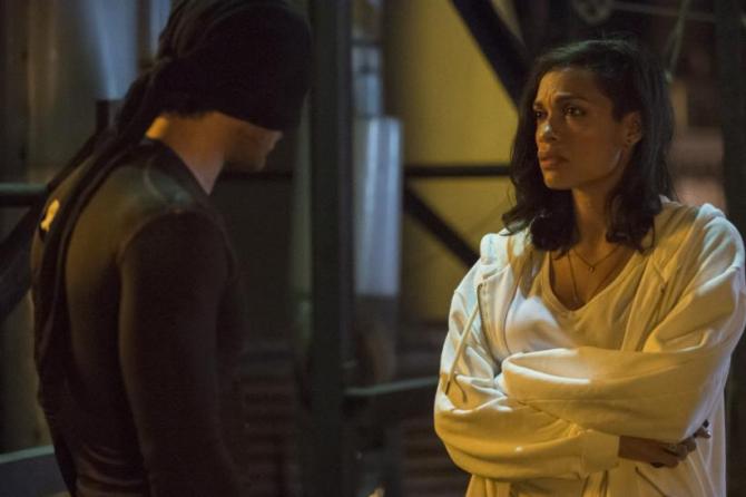 Cox – My favorite scene is in Season One, episode four when he shows up at Claire Temple’s (played by Rosario Dawson) apartment. It’s my favorite for a couple reasons. On that day, the Director and I came up with a couple fun ideas which I really liked. In the script, it says, ‘Claire Temple throws Matt his shirt’ and this is early in the series when they’re still revealing Matt’s skills. So I thought, ‘What if she throws it behind him, without him even facing that direction and catches it. So she would say her line and then someone off camera counted ‘3…2..1’ and then I put my arm out and caught it, using the character’s sonar. I just loved how that all came about at that moment. It was all shot on a set that looked like it was an upstairs apartment and, at the end of the scene, I was supposed to exit. So I asked them if they could throw a cushion out the window and then, without telling anyone, casually went out that way during one of the takes rather than the door. In a movie with a big budget, you’d see Matt sort of swing his way down but all we showed was him basically disappearing into the night and I thought that was so magical and what cinema used to be before they had CGI and you had to leave things up to the imagination.