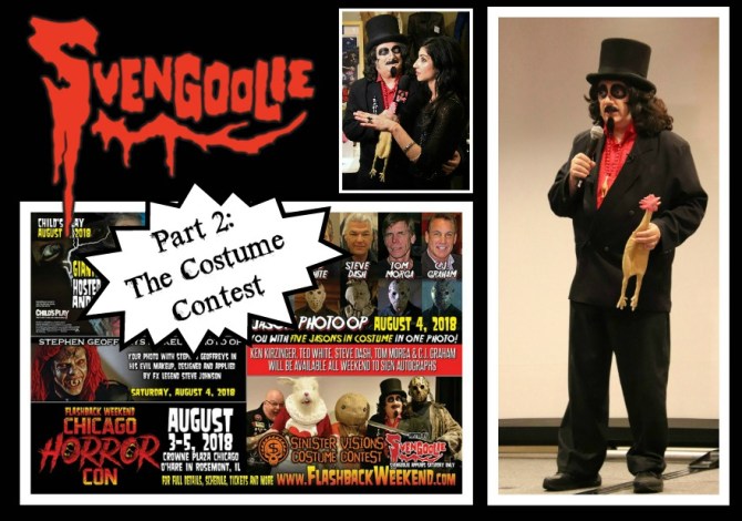 The crowd hushed as WGN Radio personality, Nick Digiglio, took the platform. For as long as I’ve been attending Flashback Weekend it’s been his job to introduce Chicago’s local-gone-national TV horror host, Svengoolie, to the audience before the annual costume contest begins. It’s a fitting role for Digiglio as they’re genuine pals and Sven’s been a guest on his program numerous times. Whether delving into the illustrious career of his alter ego, Rich Koz, or dishing on their favorite horror films, it’s always a treat for us listeners. On this occasion, however, it was a one-man show as Sven replaced him on stage. The crowd broke into applause and for good reason. For us seasoned attendees, we knew we were in for an hour of imaginative costumes coupled with Svengoolie’s quick wit and banter.