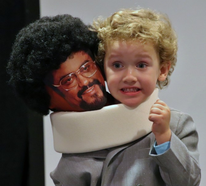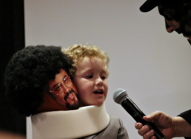 Now I’ve seen Svengoolie host a LOT of costume contests in my day and could tell that he was genuinely impressed with this bunch. They all looked great and did a stellar job being confident onstage. The winner was the cherubic son of artist, Mitch O’Connell, who was dressed as the Ray Milland/Rosey Greer composite from The Thing with Two Heads (1972). Clearly having an artist for a father has its advantages as this undoubtedly was one of the most creative kid costumes ever.