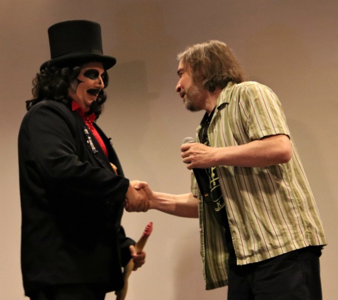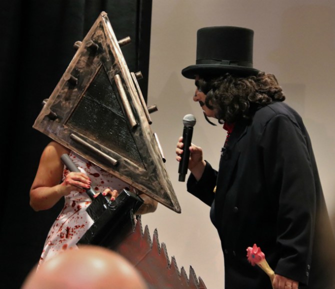 His first order of business was breaking down the rules. The contestants were to walk onstage, giving the audience a good look at their costumes. Svengoolie would ask them their names and who (or what) they were dressed as, peppering the exchange with his humorous commentary. That’s assuming, of course, he could them to talk at all since every year brings its fair share of Friday the 13th Jasons and Halloween Michael Myers who usually stay true to their characters by remaining silent. Once all the contestants had taken their turns, they’d line up so the audience could cast their votes via applause. The one garnering the loudest reaction (good or bad) would be declared the winner.