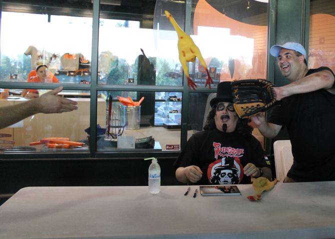 Svengoolie is not relegated to Halloween and makes appearances year round. One of the hottest ones was at a minor league baseball game where temps rose to a scorching 107 degrees! The fans didn’t care and showed up in droves anyway. Sven threw a pitch while I intercepted a rubber chicken!