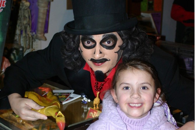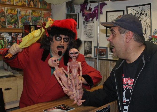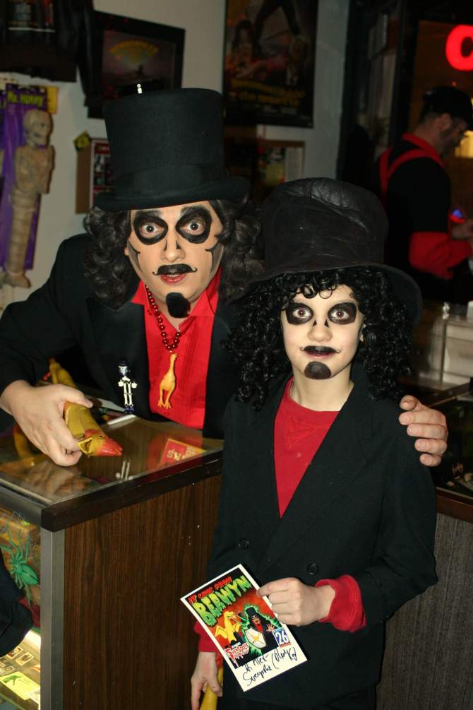 The world’s only horror store, Horrorbles, was the perfect fit for Svengoolie – especially since it actually stood in the town he and his predecessor helped make famous – Berwyn, Illinois. I remember taking my son, Alex, dressed as Svengoolie to his first appearance there. Alex had worn the costume on Halloween and I emailed Rich a photo, asking if he could wear it to Horrorbles. “Yes, please have him come in costume,” he replied. As we stood in line to get in, Svengoolie arrived and walked right up to Alex. “Your picture is going to be on TV next week!” he said. Alex was excited as was our entire extended family who tuned in to see it. I think my Grandma Francesconi about keeled over from sitting through Tales from the Crypt: Demon Knight but Alex was very proud.
