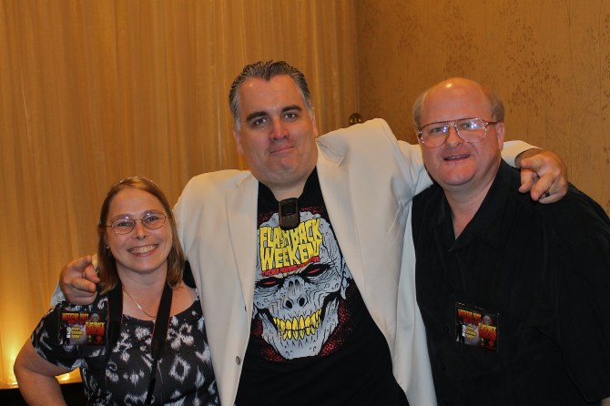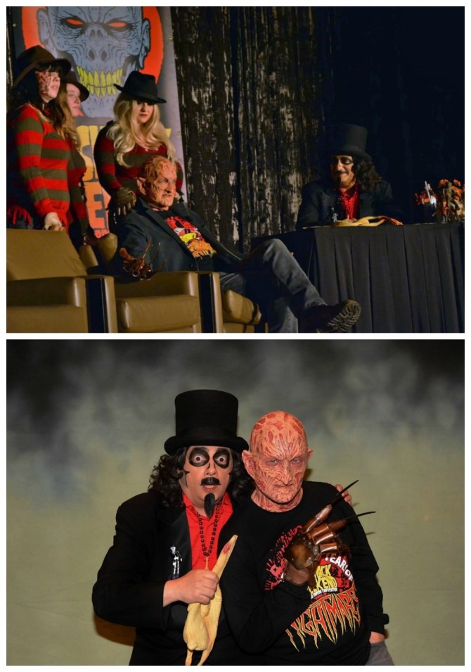 Svengoolie with cast members from “A Nightmare on Elm Street” franchiseIt was a great day when the Svengoolie crew asked if I’d assist them at Flashback Weekend when he’d be interviewing Robert Englund in his full Freddy makeup. I can’t remember what it was they needed me to do, but I sure won’t forget standing backstage next to Freddy Krueger!