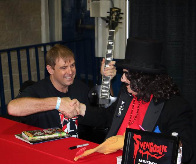 Not only was my dad a fan of the original Jerry G. Bishop Svengoolie, but claims to have been watching him in the hospital waiting room while my mother was in labor with me. So perhaps it was destiny that his protege’ (not his biological son as my mother incorrectly assumed), Rich Koz, would go on to become my favorite entertainer and that we’re still talking about him forty years later. His corny sense of humor seemed to mirror my own and I couldn’t get enough of it. Every Saturday would be an event as I’d camp out on the living floor in anticipation for the “Son of Svengoolie.” The show ended in my mid-teens after FOX took over the channel, though his character would survive off the airwaves via signings and special appearances. Meanwhile, Koz retained his broadcasting presence on FOX-32 as a weatherman and on The Koz Zone. He would resume his career as a horror host with the birth of a new local station – WCIU/The U in 1995. This time around he’d simply be “Svengoolie” with the blessing of Bishop and in 2011 go national with its sister station, MeTV, where he’s remained ever since. This has given many Chicago fans like myself the rare privilege of sharing our childhood horror host with our own kids. For me, it would also lead to the creation of this blog and years of attending his public appearances. So, in honor of Rich Koz’s special milestone, I’ve decided to open up the archives and share some highlights. This October I’ll also have a special article in Scary Monsters Magazine which will center specifically on his show with some behind the scenes. It’ll also feature some anecdotes from other fans including the great Mark Hamill. Hamill took time out of his busy schedule to call me on the phone and share his fervor of Svengoolie which was a surreal experience – one of my childhood idols calling me to discuss another. It stands as a testament to the kind of devotion Rich Koz inspires from fans; be they celebrity or Average Joes.