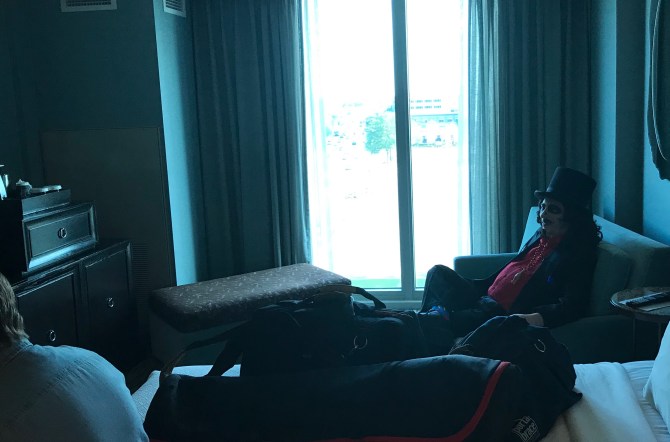 We walk inside and Don Johnston is standing ready to welcome them to the hotel. He escorts us to the elevator while people point at the man in makeup saying things like, “Holy crap! It’s Svengoolie!” and “Is that really Sven!?” Inside the elevator, a woman is wearing a Svengoolie shirt and Jim teases her for having “terrible taste in clothes.” She’s clearly starstruck and doesn’t utter a word; just stands there grinning until the elevator finally reaches her floor. As she exits, Sven thanks her for buying his shirt.