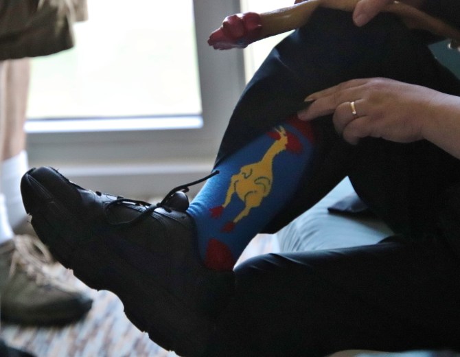 Once inside our room, the crew unloads their equipment and Svengoolie takes a seat. When he crosses one of his legs over the other I notice he’s wearing rubber chicken socks. Talk about accessorizing!