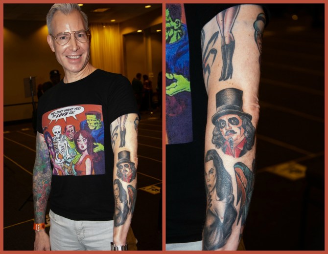I stayed behind the scenes for the remainder of the fan photos. There weren’t a whole lot of costumed fans outside of myself, though one guy sported a pretty cool sleeve tattoo with Svengoolie on it.