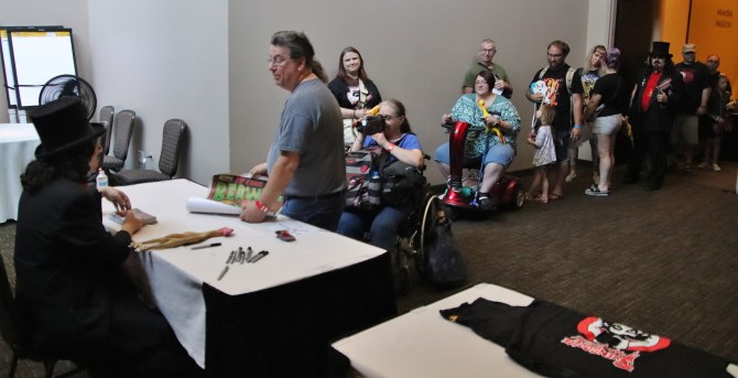 1:55 PM: Svengoolie takes a seat and settles in. The first 5-10 people in line are inside the actual signing room.