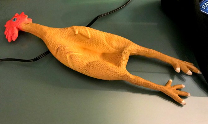 Meanwhile, Chris and Chas remove the memory discs from the cameras and set up battery chargers. MeTV footage can’t be left offsite, so everything collected today must be returned to the station before they can go home. As they leave, Svengoolie asks if I’d mind him leaving his rubber chicken in the room. This prized poultry differs from the ones hurled at him on TV and is exclusive to his public appearances. Did I mind watching over the horror host equivalent of Thor’s hammer? Not at all! After they left, I stared at it transfixed for several moments before turning in.