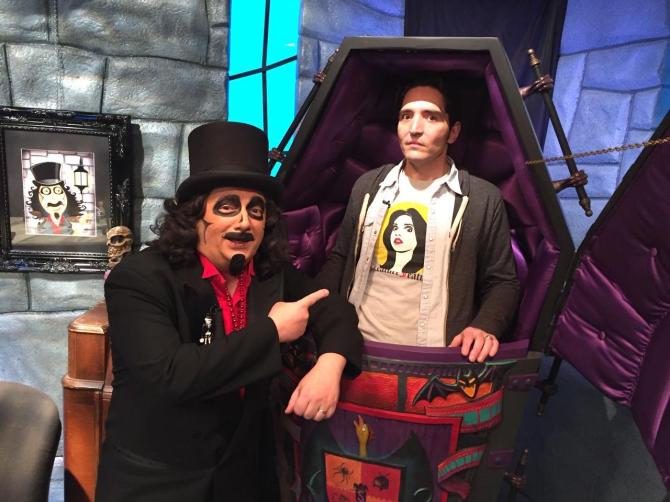 David: When I moved to Chicago I was sitting there one Saturday morning watching cartoons and eating Boo Berry cereal (yes, I was in college) and I stumbled across a teaser commercial for Svengoolie. I had seen the image before and heard the name but hadn’t figured out where to find him yet. I watched his show that day and have been hooked ever since. I was in Chicago back in 2014 doing a press tour for my indie film, ANIMALS, and I was at the WCIU station on Halsted Street doing a morning talk show. From across the studio I saw The Svengoolie set and I freaked out! I ran over there and luckily Sven’s longtime producing partner, Jim Roche happened to be there. He gave me his card and told me that I could come by later to meet Rich (THE one and only!). I brought my family back down to the studio later and we had a marvelous time. I try to sneak into the hallowed haunts every time I’m there. They’ve set up an extensive security system but I just keep hopping the fence, swim the moat, dodge the flying chickens and creep into the crypt.