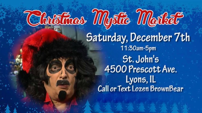 On Saturday, December 7th, I pulled into Saint John’s Church in Lyons, Illinois to see Sventa Claus. The holiday version of MeTV’s horror host, Svengoolie, has become a tradition here in Chicago and one aspect of our local-gone-national celebrity we can still claim for ourselves. I was looking forward to seeing him while also supporting my friend, Lozen Brownbear. Lozen’s an animal-lover like myself and I’d attended her “Mystic Market” fundraiser up in Elmhurst last year. It’s a great way to pick up some unique, hand-crafted gifts for the holidays while sending much-needed funds to her furry friends at the Sacred Space Animal Sanctuary and Rescue.