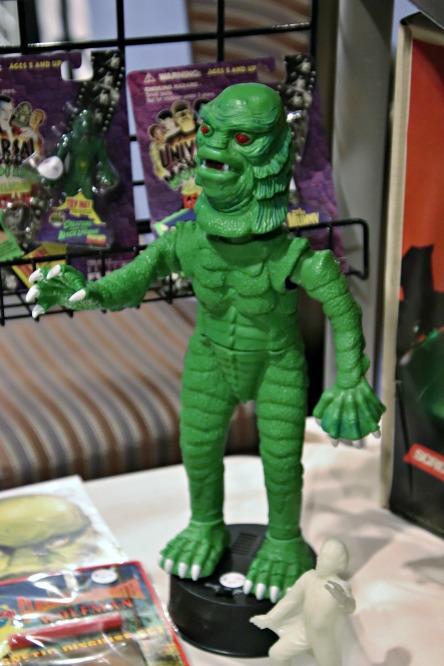 What usually happens when I do a dealer’s room with a friend or friends is that we’ll all start out together before being completely separated ten minutes later. It happens when I’m with Jason, it happens when I’m with the Urbans, and this time it happened with all three of them. This is probably a testament to convention dealers offering something for everyone. As for me, I was quickly drawn to a booth selling a hodgepodge of items including an animatronic Creature from the Black Lagoon. This item was part of a collection that Universal Studios officially licensed back in the early ‘90s. I used to have the Wolf-Man but gave it to the horror host, Svengoolie, for his show a few years back. Considering he’s the only horror host legally presenting Universal films, I thought he’d be the ideal steward of the Wolf-Man. The Creature also fits that bill while having the distinction of being Sven’s favorite Universal monster. Since the price was cheaper than what I’ve seen them going for online, I picked this one up for him. He received it about a month later as Sventa Claus (which I covered before the holidays) and it made its television debut last weekend.