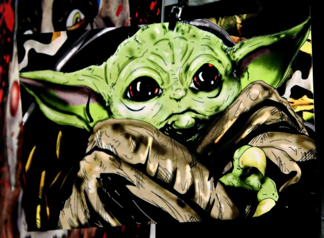 This event took place the weekend of November 22nd – ten days after the debut of Disney Plus’ hit STAR WARS series, “The Mandalorian.” One ambitious artist was already selling images of its title character as well as the child a.k.a. “Baby Yoda.” Despite having an overabundance of wall hangings, I was almost tempted to buy this out of general principle. “Baby Yoda” and the Mandalorian is one of the few STAR WARS projects that hasn’t caused this old-school fan to cringe in the last 20 years.