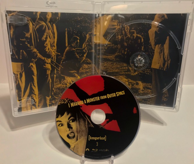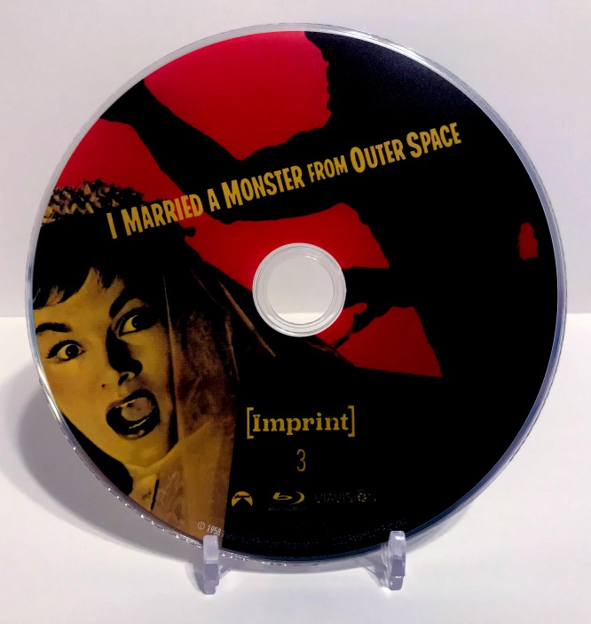 The disc case is clear and, once opened, features a scene from the movie visible through the transparent plastic. The disc, itself, matches the slipcover. Here is a closer look at I Married a Monster from Outer Space.