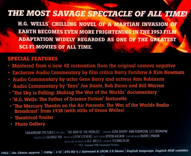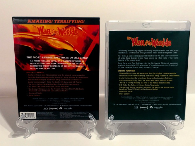 Most of the bonus features are the same for both this release and Criterion’s. This version offers commentary from actors Gene Barry and Ann Robinson which the other does not. It boasts a 4K scan taken directly from the “original camera negative.” Criterion’s is also a 4K scan but doesn’t specify the source. Imprint’s version has an exclusive H.G. Wells featurette while Criterion has an extra called “Movie Archaeologists” about visual/sound effects, an audio interview with George Pal, and the original 1940 radio show with a discussion between Orson Welles and H.G. Wells.