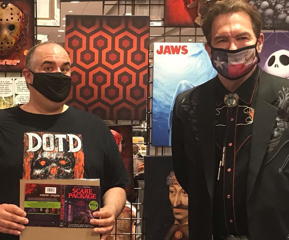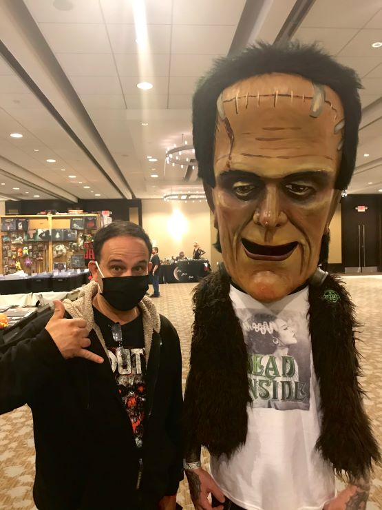 Briggs’ offered all kinds of merch at his booth including T-shirts, a 45 RPM record set, action figures, posters, and the traditional 8 x 10 stills. Since I’d brought along my own item for signing (a Blu-ray insert of the 2020 movie Scare Package) it only cost me $10 for an autograph and selfie. Not bad at all! I’d already decided I wasn’t going to pay extra for selfies or photo ops because of the whole mask thing. Don’t get me wrong, I’m not against wearing a mask and respect anyone who supported the event with a paid photo op. But for me, personally? Forget it! I saw a couple of those pro shots online and they reminded me of when I visited the Black Hills of Dakota a few years back. There was a place offering professional photos of your family and friends made to look like they were taken back in the old west. With everyone wearing masks, these photo ops looked like “Joe Bob and his gang of outlaws.” Briggs was very friendly and spoke of how much he enjoyed meeting Svengoolie (at the station behind the scenes) and that he’s hoping they can team up for an event when this pandemic is finally over.