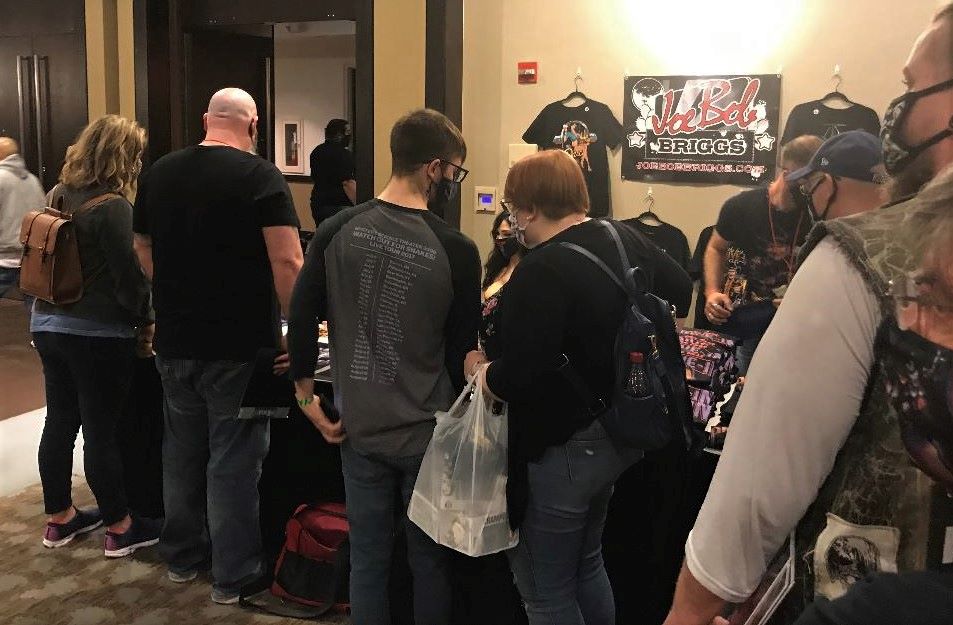 I noticed a line had already formed at horror host, Joe Bob Brigg‘s, booth so I decided to head over. I’ll say this about the weekend – social distancing was definitely not happening although everyone was wearing masks. The main issue with wearing masks at this event (aside from taking crummy photos with celebrity guests) is that the Crowne Plaza is notoriously HOT and I’m a natural hotbox. Consequently, I could only spend so much time in the hall before sweating bullets and getting light-headed. Thankfully, Joe Bob showed up on time, joined by his buxom assistant, Darcy the Mail Girl. There weren’t a lot of people ahead of me but one of fans wouldn’t shut up and took forever. He was from Joe Bob’s home state of Texas and decided to use this opportunity to cover the man’s entire career from syndicated columnist to his current Last Drive-in show on the Shudder streaming service. While standing there melting, it occurred to me that what this horror host needs is a Jim Roche to help keep things moving. That man has Svengoolie appearances down to a science – maintaining the flow while providing ample time for meaningful interactions.