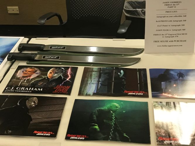 Amid all the customary 8×10’s available for signing, there were a handful of small machetes with the Friday the 13th logo on them. These went for $70 which included a signature. “They only bring a few of those machetes to every show,” he explained. “I want to make sure I get one!”