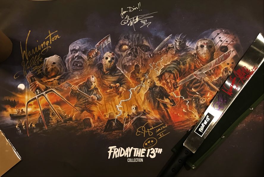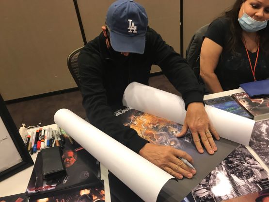 I decided I’d have actors who played Jason sign in gold and all others in silver. with CJ Graham the first. CJ, as you may recall, braved Covid to fulfill his obligation and attend Days of the Dead July 2020 in Indianapolis. He was a much-needed highlight in a pandemic-decimated show. Although many fans will point to Kane Hodder as the quintessential Jason, my allegiance will always be with Graham as Part VI is one of my favorites in the franchise. I was early and none of the guests had arrived. CJ, being a military man, is known for always being on time so I had no qualms planting myself in front of his booth. Not long after, I noticed another fan nervously pacing nearby. He continuously inspected the items available for signing, walking away, and then returning to make sure nothing had disappeared in the seconds they were out of his sight. He must have noticed me staring as he gave me an explanation…