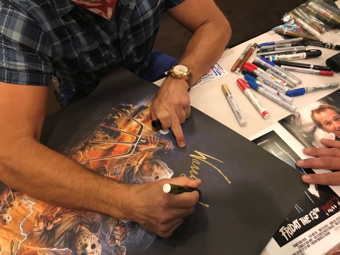 By the time CJ finished signing, Warrington Gillette arrived and added his signature to both the poster and the machete as well. I brought my own sharpies but Gillette had me beat. He literally pulled out an attaché case full of sharpies and paint markers in just about every color imaginable. He even tested them on scrap pieces of paper just to make sure they’d work properly before signing. That extra step goes miles with us collectors.