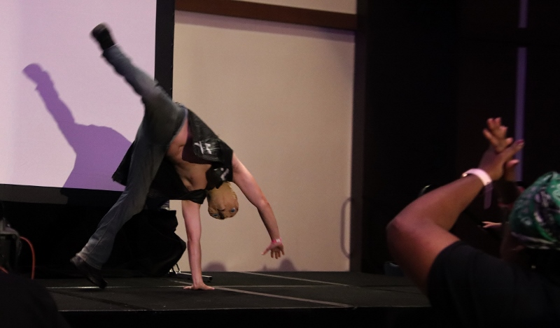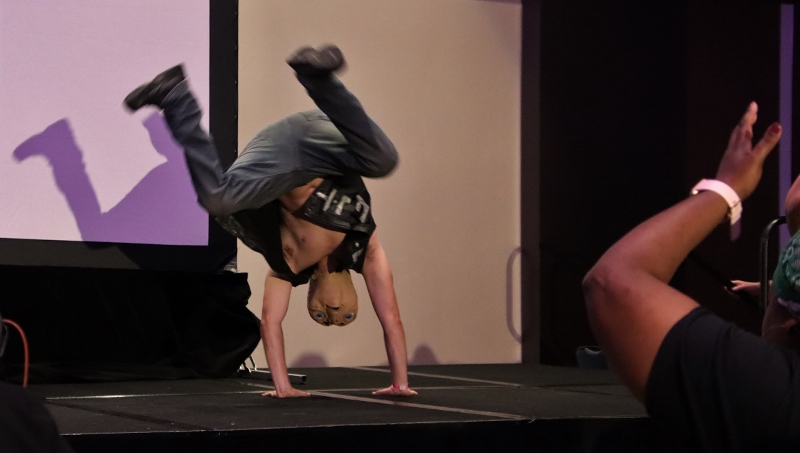 After finally relinquishing the microphone, he began doing cartwheels before finally leaving the stage.