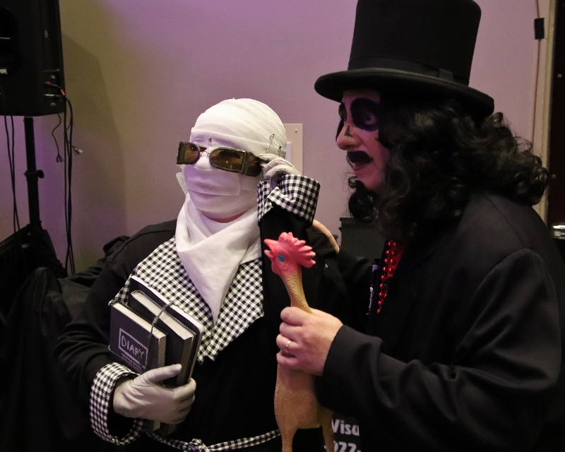 After Svengoolie gathered all the adult participants (who were so numerous, judging had to be done in two separate line-ups), Stone Cold E.T. began yelling more wrestling talk before getting fake-stabbed by one of the Michael Myers contestants. Stone Cold was a good sport and played along; grabbing his “wounds” and dramatically falling to the floor. This set off the Dr. Loomis contestant who started yelling, “No, Michael!!!” Before pretending to shoot him with a faux pistol he had in his pocket. Now, with two contestants lying “dead” on the floor, it had become official – this was the whackiest costume contest I’d ever attended!
