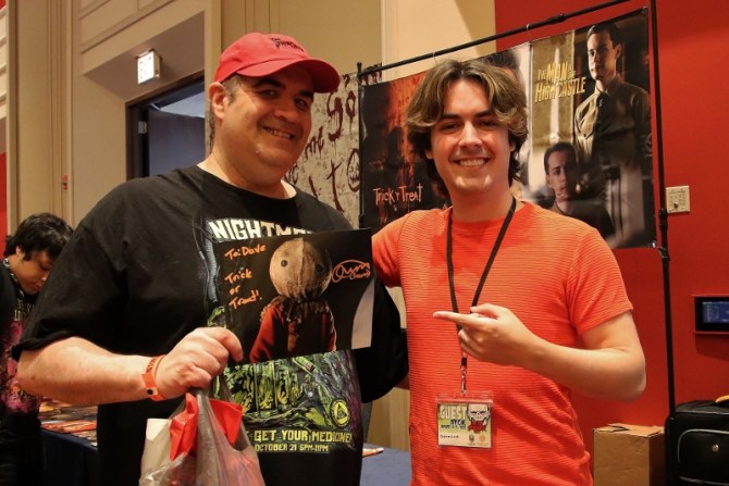 We arrived at the Hyatt Regency O’Hare just in time for Flashback Weekend’s Registration. My friend, Jason, flew in from Rhode Island the day before, and our friends, Don and Bunny, were already indulging in the perks of their VIP pass with early admittance to the dealer’s room. As soon as we saw them, Bunny gave me the full lay of the land so I could strategize. As a general rule of thumb, you want to meet the celebrity guests on your list first and foremost. This year my autograph goals were minimal – Quinn Lord and John Michael Graham. The latter was for the purpose of adding yet another signature to my Halloween (1978) poster which I discussed last year. Bunny informed me the closest guest, however, was Quinn Lord a.k.a. Trick r Treat Sam, making him my defacto first stop.