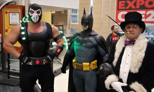 8:00 pm – While heading back to the train station, I saw a guy dressed as Bane standing about ten feet from a cool-looking Batman and Penguin. I asked Bane if I could take his picture and, after he agreed, asked if he was with Batman and Penguin so they can be included in the photo as well. This apparently hit a nerve. “No!” he snaps, looking right at them and speaking loud enough for them to hear. “And you’d think they would have come over and wanted to take pictures with me so we could all be together!” I told him to hang tight while I asked Batman if he and Penguin wouldn’t mind coming over for a group shot which they agreed.