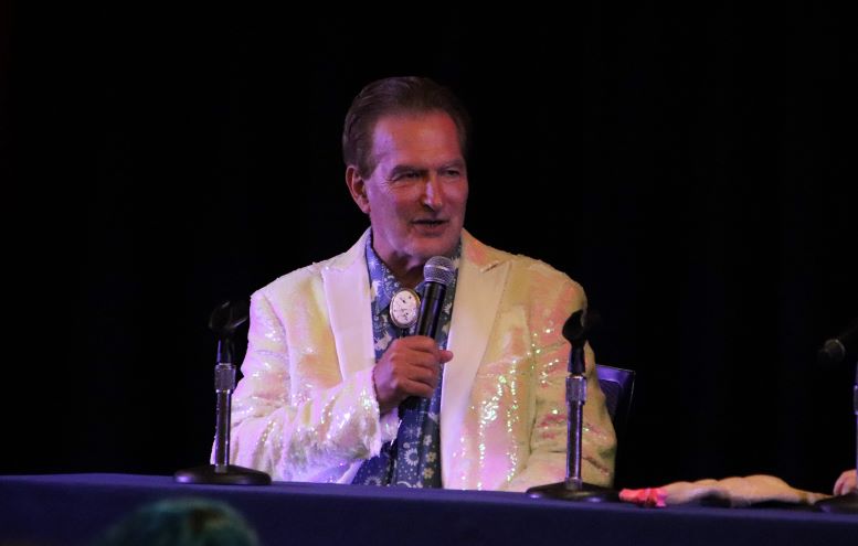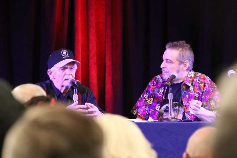 Next up was the event I most anticipated. I can’t explain how surreal it was watching Joe Bob and Svengoolie walking to the stage together. Everyone knows I love my Svengoolie Saturdays but Friday nights belong to Joe Bob whenever his all-to-brief seasons run on Shudder. My friend, Jason, from Rhode Island, and I text each other throughout his show trying to guess what movie he’ll show while commenting on his and Darcy the Mail Girl’s banter. I felt bad that Jason couldn’t join me this year as he’d done the previous two Flashbacks but tried keeping him in the loop whenever I could.