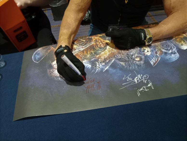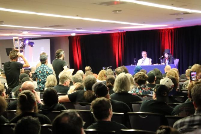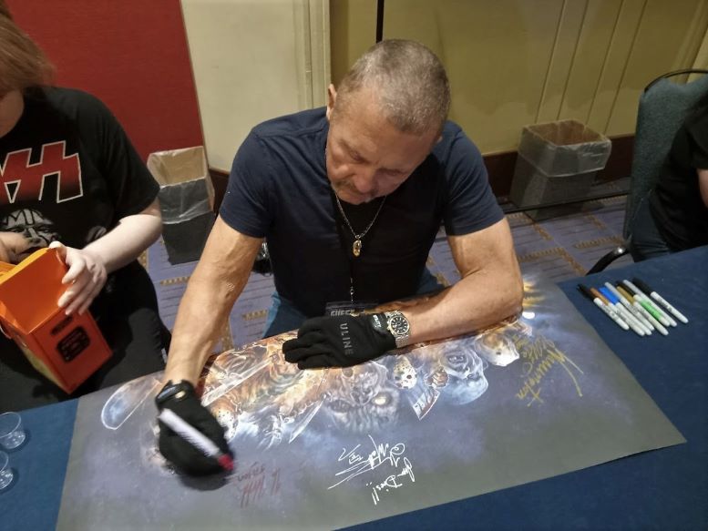 He offered both soundtrack CDs and 8x10s for signing. I noticed he also likes to draw and would add musical bars to his autographs. I’d brought along my own item to sign – the original vinyl for Halloween II that I’d picked up a couple of years ago at Half Price Books. As he signed, I told him how much I admired his work and that I really enjoyed his interview on the Nick D podcast with Nick Digilio who would also be moderating several panels for Flashback Weekend. “Wasn’t that a great show?” he replied, with a noticeable Midwest accent that betrayed his living in California for the past fifty years. Howarth performed a concert at Flashback Weekend which would prove something of an oddity but I’ll get into all that in my next post.