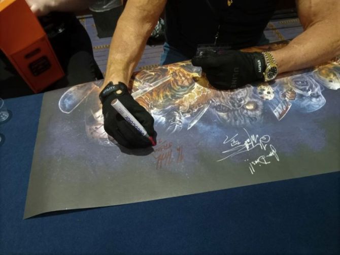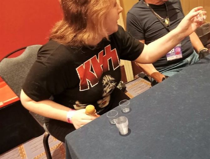 I returned to Hodder’s table and, this time, he was there and with a relatively short line. By the time I left that line would stretch out into the foyer. The $20 afterglow I was experiencing from Howarth’s table soon fizzled when I saw Hodder was charging three times the amount. A fan standing behind me also brought along a machete for signing only his was straight from the tool shed. We both stood around holding and admiring each other’s weapons which, had this been an old movie, probably could have been mistaken as gay subtext. Just before it was my turn, a friend of Hodder’s wearing a KISS t-shirt showed up with two bottles of tequila and offered us all a shot. “We’re all going to give a toast to Alton!” she said. So we all “clinked” our small plastic shot glasses while exclaiming, “To Alton!” (whomever he may be).