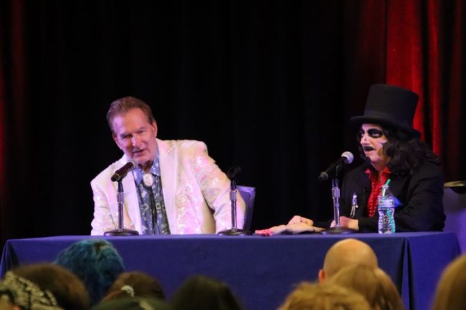 When Sven arrived with the rest of his crew – Producer Jim, Associate Producer Jane, and cameramen, Patrick & Chuck. I held up my mask and asked Svengoolie (who had yet to see the finished mask in person), “Does this creep you out?” “Why, yes, yes it does!” he replied. With no time to chat, Svengoolie and his producer, Jim Roche, quickly headed over to the photo op area while the cameramen and I went into the room directly across from it. It was here that all the Flashback Weekend panels took place as well as their annual costume contest. I was just in time to watch Nick Digilio’s interview with Dick Warlock who played Michael Myers in Halloween II. I was soon to discover, however, that Warlock was so much more. Instead of using the full hour to discuss Halloween, Digilio made the bold move by delving further into Warlock’s resume’ instead. Warlock has a rich Hollywood history having worked with Kurt Russell in his younger years at Disney as well as becoming his stunt double in almost every other movie he made since. He’s even stunt-doubled for the legendary Helen Hayes. Digilio’s move paid off as audience members (including me) were visibly impressed with his body of work and entertaining anecdotal stories. In the end, nobody complained that only about ten minutes were spent on Halloween II.