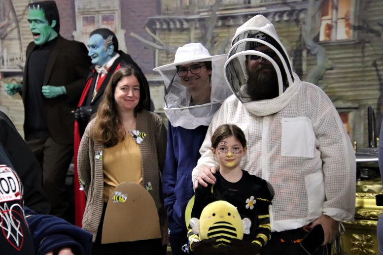 I saw my friend, Jim Currie, and his family dressed as “Zom-Bee Keepers.” Jim used to live near Brookfield Zoo where he organized his neighbors to deck their houses in Halloween decor and scary scenes. Every year I’d bring my four kids and walk along his street; checking out all the amazing set-ups. Jim has since moved to a more rural locale which directly inspired his family’s costume choices this year as they are now proud and successful beekeepers. They graciously gave Svengoolie, Jim Roche, and me some of their homespun honey which was delicious!